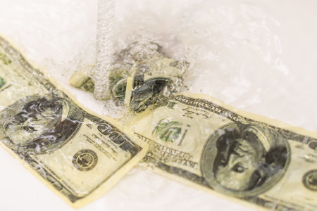 Cleaning a dirty American one hundred dollar bill. money on the black market. Banknotes of 100 dollars in the hands of men near water jets in washbasin