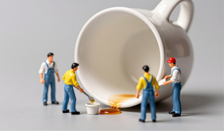 Four tiny workers in blue overalls and yellow shirts gather around a tipped coffee cup, cleaning up a brown spill. Their teamwork shows effort and focus in this playful scene.