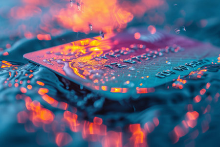 Credit card with water droplets on a table, closeup photo of a financial transaction concept