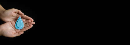 Tap water drop and palm. Symbol of water shortage or cutoff of water supply. Selective focus. Background with copy space for text, toned