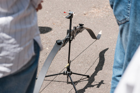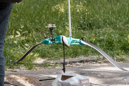 A recurve bow is displayed on a tripod for archery practice outdoors, with blurred legs of people nearby. suggests a setup for aiming training