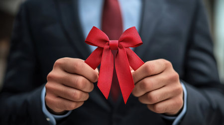 This stunning image captures an elegant red silk bow on a smooth white fabric, ideal for enhancing festive occasions, gifts, or elegant design themes.