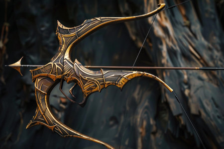 Fantasy bow and arrow with intricate gold details is shown against a dark background