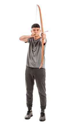 Handsome Asian archer with bow on white background