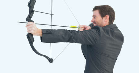 Caucasian businessman with bow and arrow against copy space on white background. business and technology concept