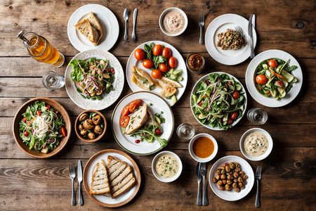 An overhead view displays multiple plates of food with various dishes. The composition features diverse food items and ingredients, showcasing color and texture. The lighting appears soft, indicating an indoor setting. This image is suitable for culinary and lifestyle-related projects, including editorial features and advertisements.