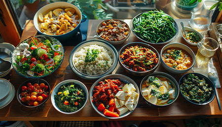 An inviting dining setup showcasing a variety of dishes on a wooden table. Vibrant colors and generous portions create a warm, communal dining experience.