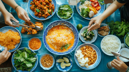 A beautifully arranged Asian meal featuring various rice dishes, fresh vegetables, and herbs, showcasing vibrant colors and delicious flavors for a delightful dining experience.