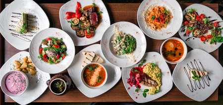 Top view of various comprehensive lunch European eating on wooden table. Variety of dishes made from fresh, natural products, salad and drinks. Cooking backgrounds concept. Copy ad text space, poster