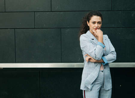 Business and lifestyle concept: Young african american woman near modern business center