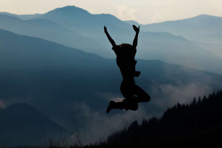 Jumping and jumping on the mountain with cloudy sky, Thailand.