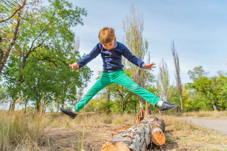 A small beautiful blond boy is walking in the summer forest, climbing a wooden staircase. Close up.
