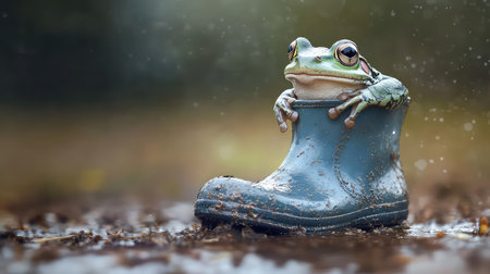 A charming frog relaxes inside a blue rubber boot amidst a wet environment. Water droplets add to the whimsical nature, showcasing the frog's joyful personality and connection to nature.