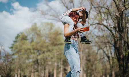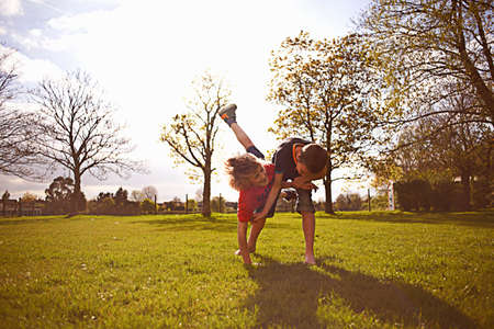 Two young boys playing joyfully in the grass, showcasing their energy and happiness in a sunny outdoor setting, perfect for family-themed content.