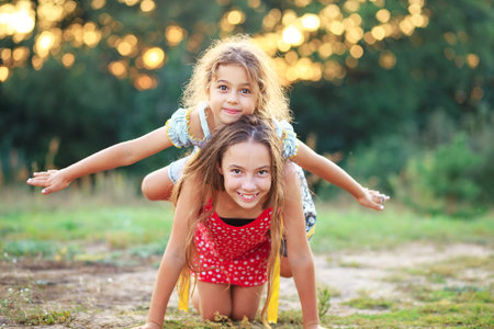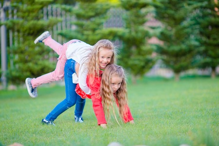 Two Cute little girls playing and laughing at the countryside. Happy kids outdoors concept