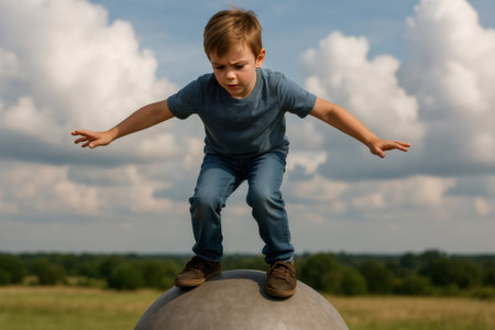 Child balancing carefully on a sphere in a field, demonstrating balance and coordination under a cloudy sky