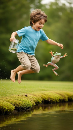 A young boy in a blue shirt and khaki shorts jumps over a pond, attempting to catch a frog with a jar in hand, conveying a sense of adventure and childhood joy.