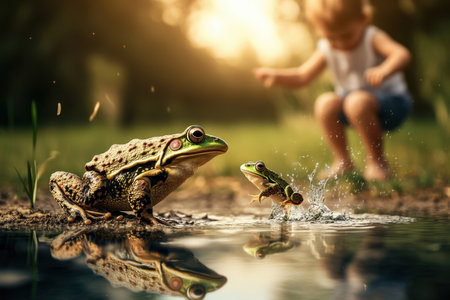 A child enjoys playful moments near a pond as frogs jump in water, creating splashes at sunset.