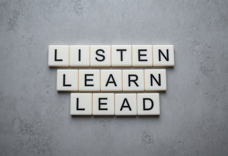 Three powerful words arranged in tiles: listen, learn, lead. These promote personal growth and inspire action in professional settings, encouraging self-improvement and effective leadership.