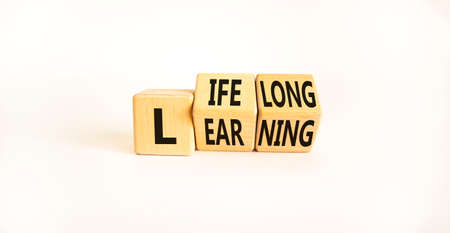 Lifelong learning symbol. Turned wooden cubes with concept words 'Lifelong learning' on a beautiful white background. Copy space. Business, educational and lifelong learning concept.