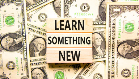 Learn something new symbol. Concept words Learn something new on beautiful wooden blocks. Beautiful background from dollar bills. Business motivational lifestyle learn something new concept Copy space