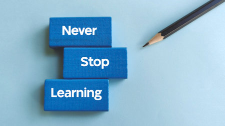 Never Stop Learning Text on Blue Blocks with Pencil Representing Continuous Education, Growth, and Motivation