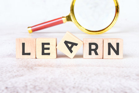 Wooden blocks spell out the word learn beside a magnifying glass, symbolizing the pursuit of knowledge in a cozy study space filled with curiosity and inspiration