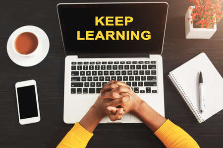 Keep Learning Text On Laptop Screen Standing On Students Table Indoors. Above View, Cropped, Collage