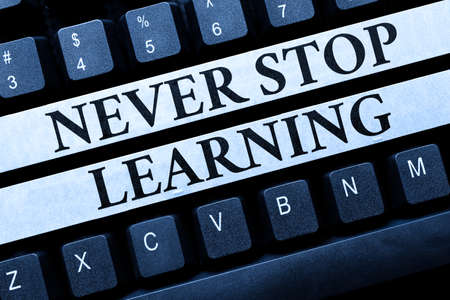 Never Stop Learning - an inscription on a notebook on a table with a clock and office supplies. Business concept