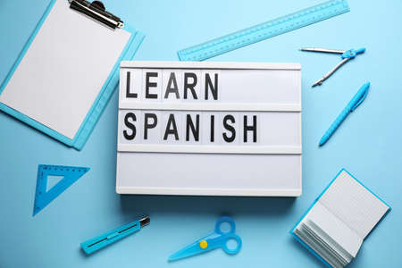 Board with text LEARN SPANISH and stationery on light blue background, top view