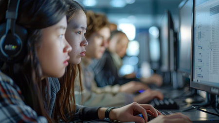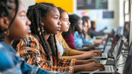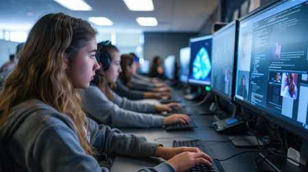 Focused students work on computers in a technology class, coding and developing software as part of their education. AIG41