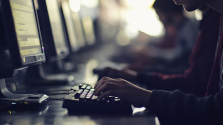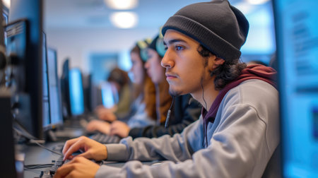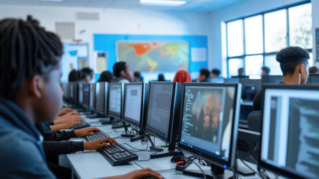 Students are deeply engaged in activities within a computer lab, focusing intently on their screens while working on various projects and tasks.