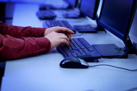 The mans hands work on a black keyboard on a personal computer. Esports player. Dark lighting in the office.