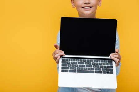 Cropped view of positive preteen schoolboy holding laptop isolated on yellow