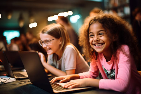 Happy girls coding learning. Pause break. Generate AI