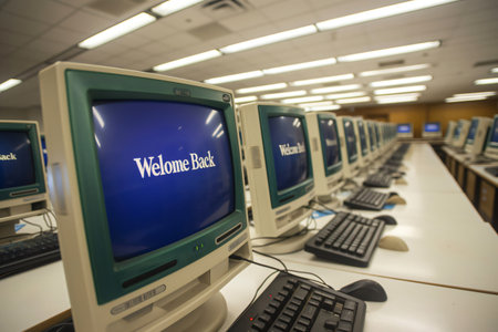 Many old desktop computers in a row displaying a welcome back message on their screens