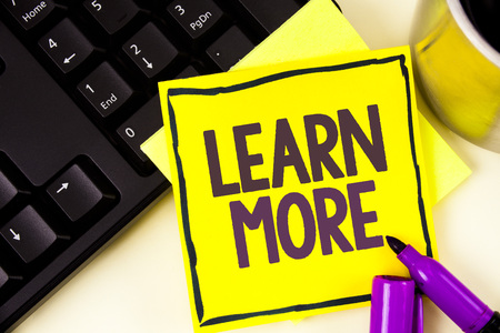 Handwriting text Learn More. Concept meaning Study harder Develop new skills abilities Get extra education written Sticky Note paper plain background Cup Marker and Keyboard next to it.