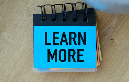 A blue notebook with the word Learn More written on it. The notebook is made of paper and has a black border