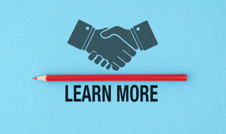 A pencil is placed next to a handshake symbol, with the words Learn More written below. Concept of learning and growth, as well as the importance of communication and collaboration