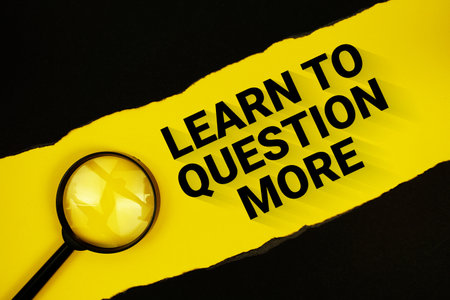 Learn To Question More text on yellow with black paper torn ripped and magnifying glass