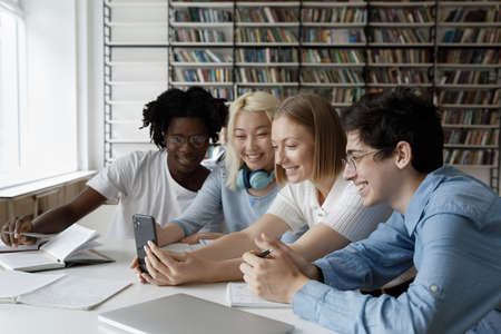 Group of multi ethnic students have fun during break use smartphone, look at screen enjoy new mobile application, watch video vlog, spend time on internet gather sit at table in library. Tech concept