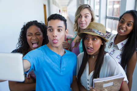 Diverse group of young people taking selfies while having fun in college