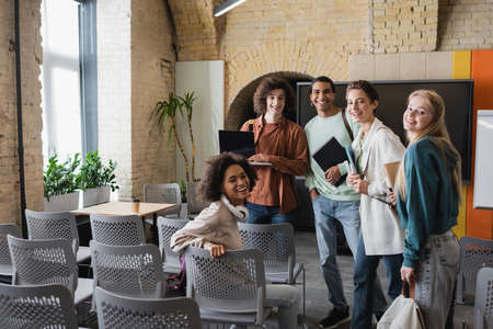 cheerful multiethnic friends with notebooks and laptop smiling at camera in auditorium