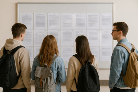 Group of students with backpacks reading information on a classroom bulletin board. concept of education, learning environment, academic engagement.