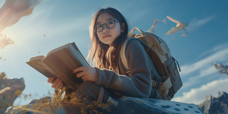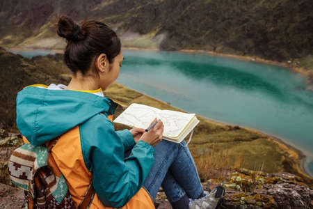 Young asian woman with backpack sitting on mountain and reading a book.