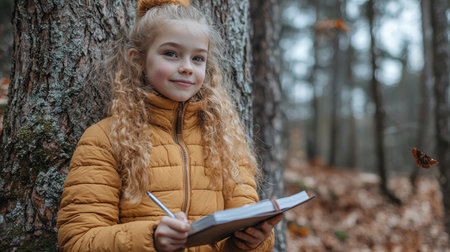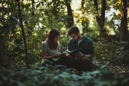 Two individuals engage in reading and writing amidst a vibrant forest setting filled with greenery.