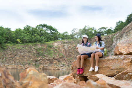 Young girl asian together with backpack sitting on big rock open maps location travel trip in the mountain and lake