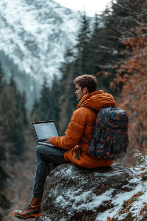 Man during hike sitting on a rock with a laptop on his lap. Remote work. A man finds a peaceful spot on a rock, using his laptop to stay productive while hiking in the great outdoors.