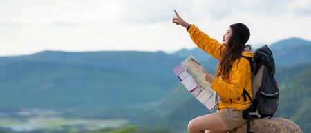 Women hiker or traveler with backpack adventure holding map to find directions and sitting relax on the mountain nature, text for banner and copy space. Travel and Lifestyle Concept