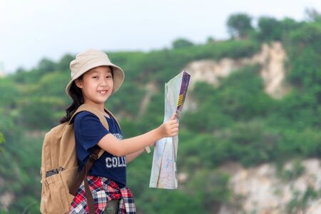 Asian girl holding map for check location adventure, tourism for destination leisure trips for education and relax in outdoors on mountain. Travel vacations and Life Concept